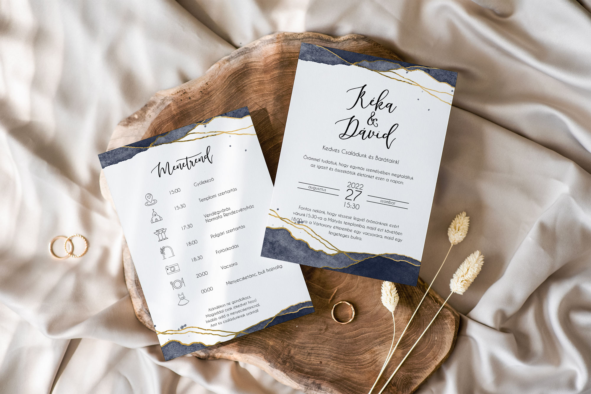 Ez a akvarell esküvői meghívó az arany részleteivel hívja fel magára a figyelmet. Tökéletes kiegészítője a kéknek, letisztult eleganciát sugároz.