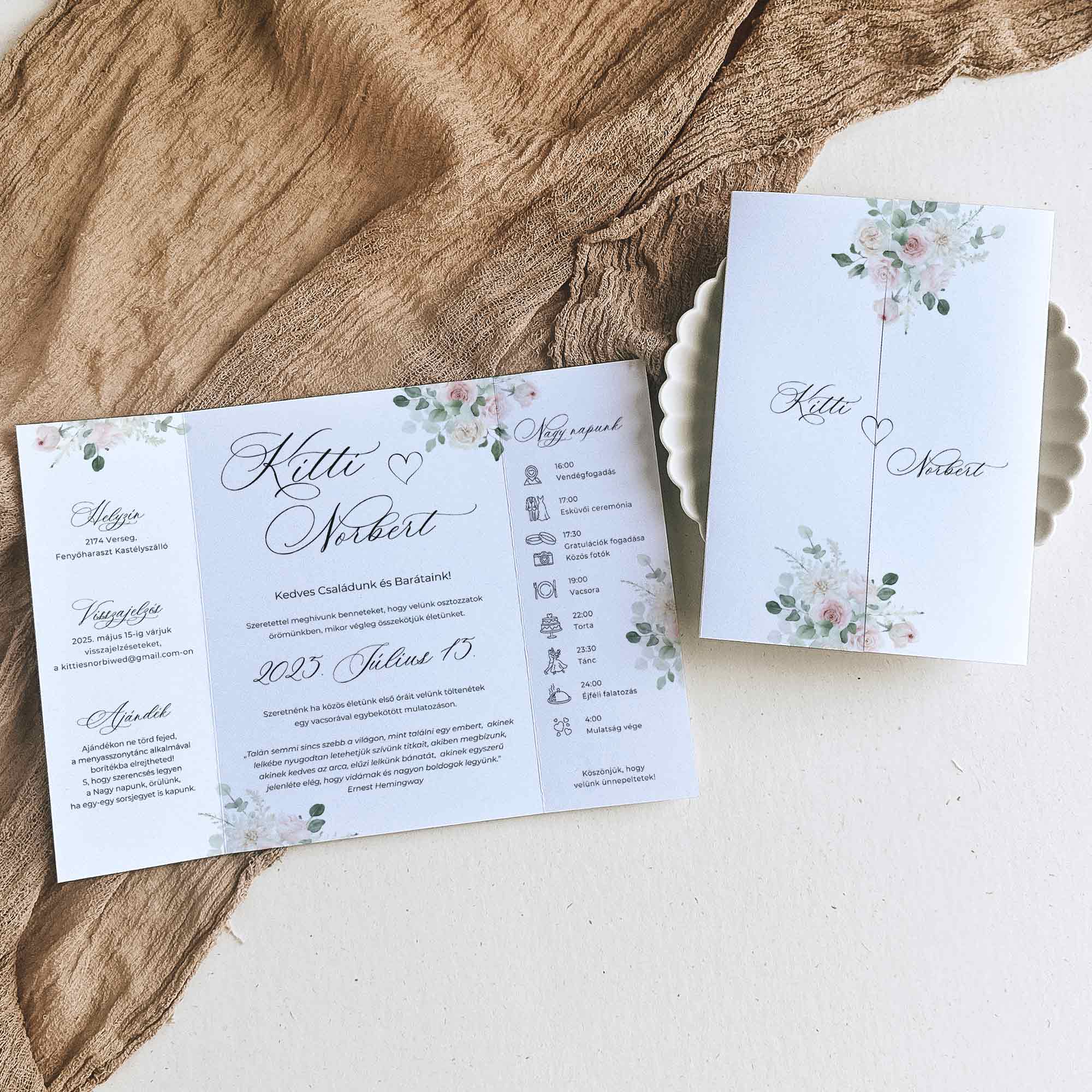 Virágos esküvői meghívó, oltárhajtott formában