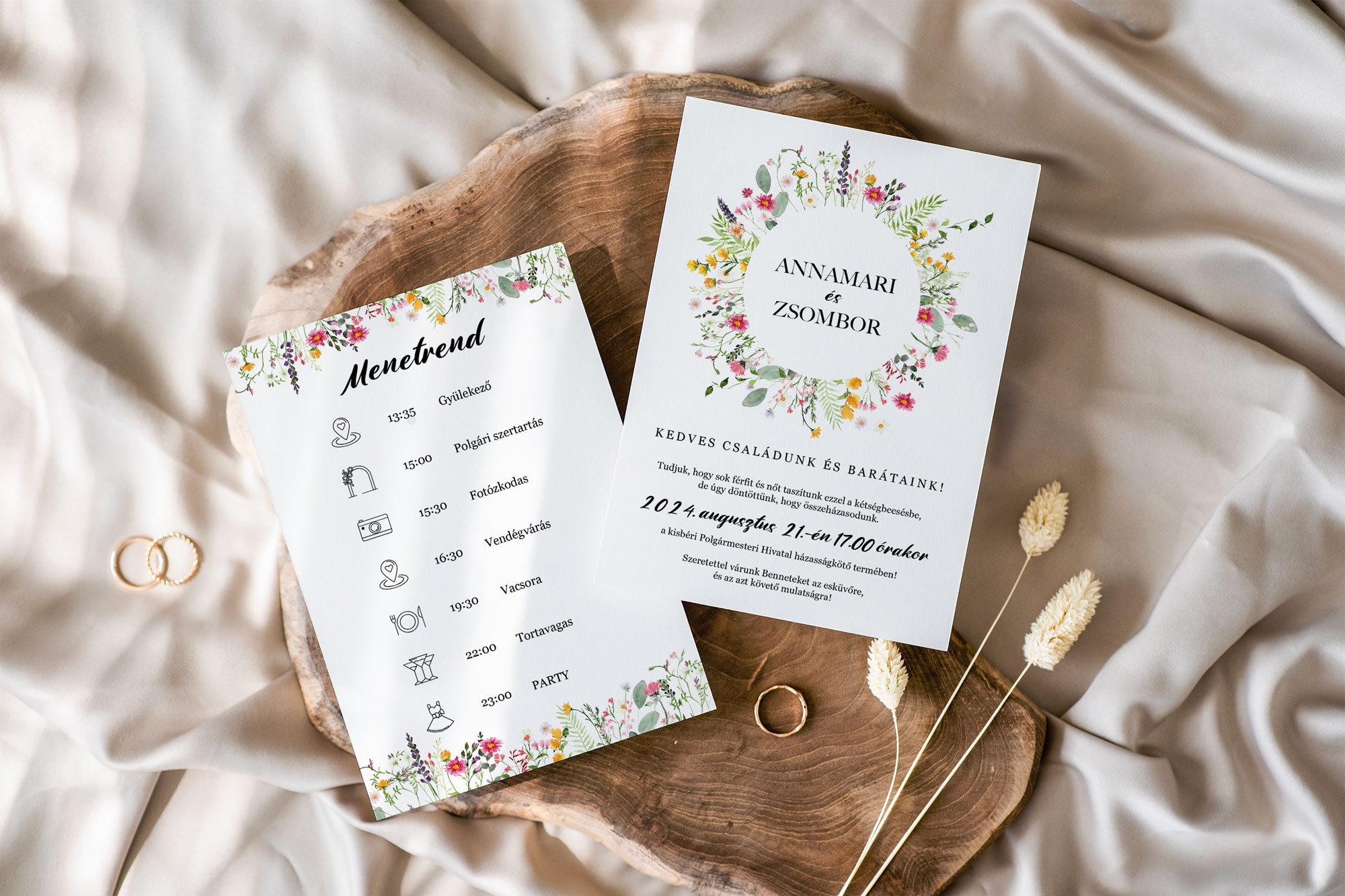 A természet üde zöld árnyalataival díszített meghívó. A finom növényi motívumok és a klasszikus tipográfia tökéletes egyensúlyt teremtenek. Kiváló választás szabadtéri, erdei vagy kert esküvőkhöz.