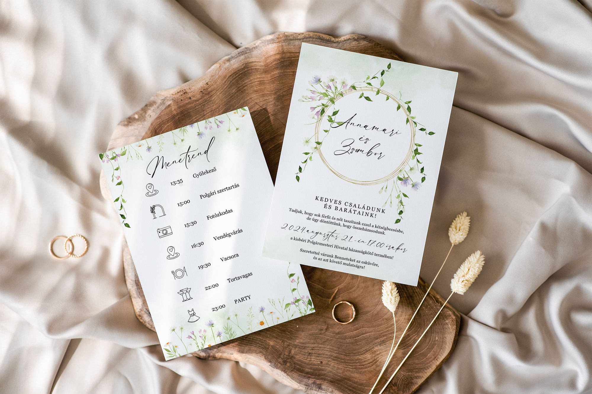 Ez a greenery esküvői meghívó a zöld apró mezei virágokkal hívja meg szeretteidet a nagy napra. A friss levelek és természetes színek nyugalmat és harmóniát árasztanak, az arany karika pedig tökéletesen passzol a modern és bohém esküvői dekorációkhoz.